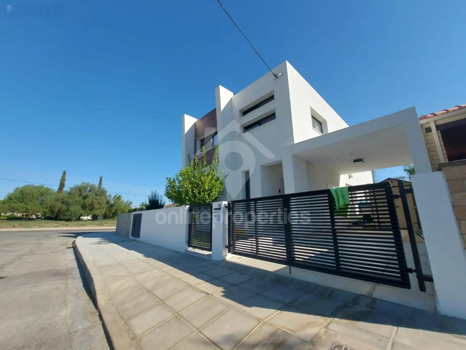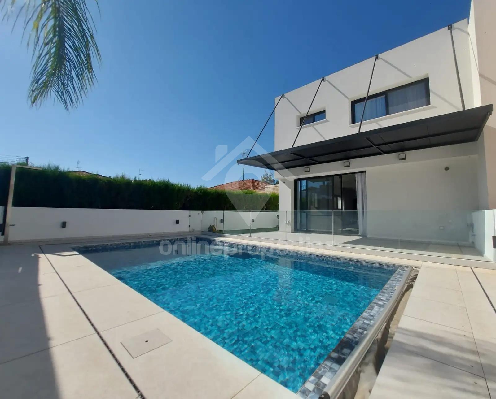 Presenting an exceptional, newly built (2023) semi-detached villa that combines modern luxury with eco-friendly efficiency. This impeccable property is perfect for those seeking a high-quality, low-maintenance lifestyle in a prime residential location close to schools, shopping malls, and universities.Property Overview:Construction Year: 2023Energy Rating: APlot Size: 290 m²Internal Built Area: 198 m²Covered Verandas: 30 m²Status: UnfurnishedParking: CoveredKey Features:Private Swimming Pool: 24 m² heated pool (chlorine) with a practical pool cover.Full Air Conditioning: Climate control units in every room for year-round comfort.Photovoltaic System: Significant reduction in electricity costs.Modern Comforts: Underfloor electric heating, water pressure system, and flyscreens on all windows.Security: Fitted alarm system and CCTV for complete peace of mind.Interior Layout:Ground Floor:Spacious Open-Plan Living: A bright and airy area integrating the living, dining, and modern kitchen, featuring direct access to the veranda and pool area—ideal for indoor-outdoor living and entertaining.Gourmet Kitchen: Fully equipped with a fridge, oven, electric hob integrated into a stylish island, ventilation hood, and dishwasher.Guest WC: A convenient separate cloakroom for guests.Practical Storage: Clever storage solutions including under-stairs space and corridor closets.Upper Floor:Master Suite: A generous double bedroom featuring a private en-suite shower room.Three Additional Bedrooms: All well-proportioned and perfect for family or guests.Shared Family Bathroom: A modern main bathroom serving the additional bedrooms.Laundry Corner: Practical space equipped with a washing machine and dryer.