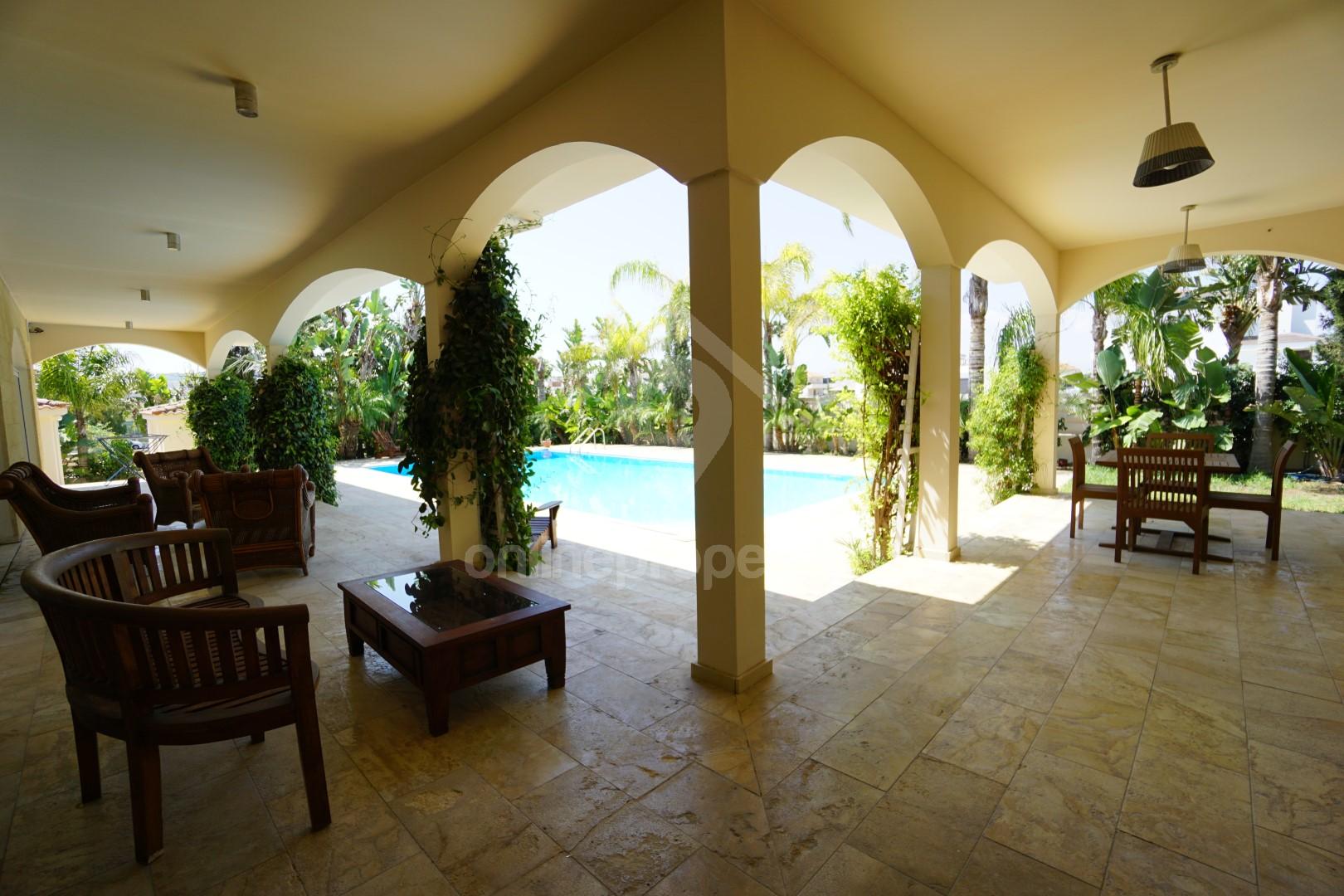 This mediterranean style home is a perfect mix of luxurious comfort and modern edge. The L shape structure creates and inside out effect on the inside as it is all glass windows which overlook to the rick south american inspired garden and pool. This is a perfect location for someone who wants to be close the center yet wants to feel secluded and privately in peace. The breeze that hits the dancing palm trees is all year round and the flowers multiply every spring. The kitchen is ultra-modern and the Italian furniture mix and decor mix the perfect combination of modern design and comfort. The fireplace in the living room sitting area is made out of stone which also surrounds the pool and some parts of the exterior of the house. There is a large dining table area that fits a minimum of 10 people. The sitting arrangement around the pool is also exceptional. The library room allows you to store books and computers, the security tv is also there in order to monitor the camera system around the house (optional). There is a second relaxation room which houses a grand piano. There are 2 rooms on the ground floor and 4 rooms in the second floor. All rooms are en suite. The master room upstairs also sports a jacuzzi in the bathroom with a pressure system and an all-around view. The parking fits up to 4 cars. There is a shower next to the pool and an outside bathroom. There is also a small house in the garden which can be used for the housekeeper's quarters or a guest room.