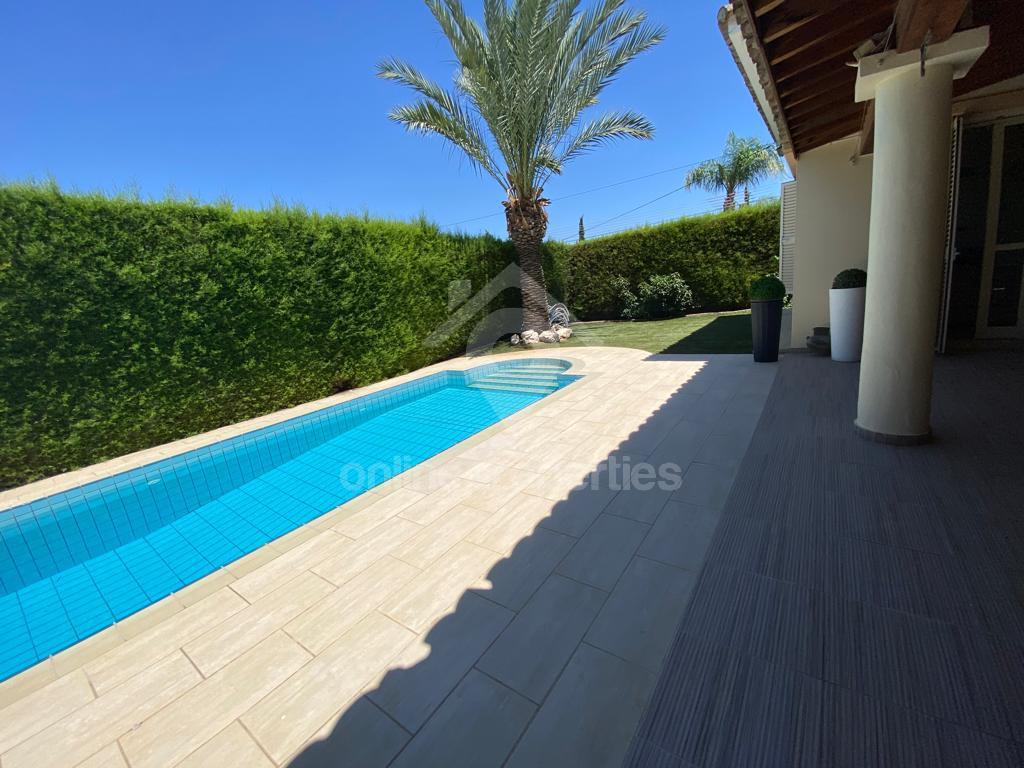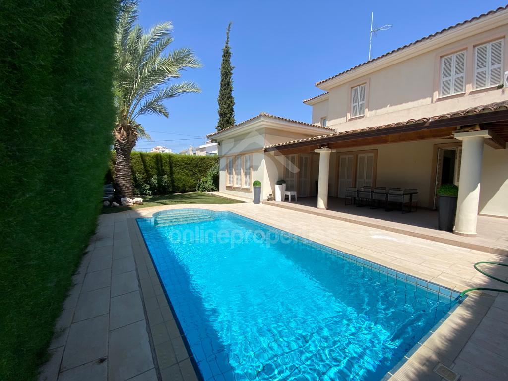 In Latsia, few minutes from Nicosia, in a nice residential area, near the Mall of Cyprus, Ikea,General Hospital, Athalassa Forest, Sporting club, schools, easy access to the highway, fully furnished two story house, in mint condition, total surface 365 m2 on a 550 m2 corner plot, it features:Ground floor: An entrance gallery leading to a 5m cathedral ceiling living room with fireplace, a dining room, a study room and a separated fully renovated and equipped kitchen, a guest toilet, a maid’s room, a bathroom with shower and w/c. A covered terrasse of 65 m2, a swimming pool and lounging green area with mature garden.! !First floor: A master bedroom with en suite bathroom shower and w/c, 3 other bedrooms, a bathroom with bathtub and w/c.and a brand new shower with w/c .Covered garage for two cars. Alarm system. Fully air conditioned. Split unit Hot/cold. Central heating.Swimming pool and garden maintenance additional 200 per month.2 month deposit required.